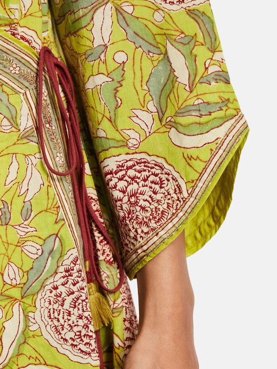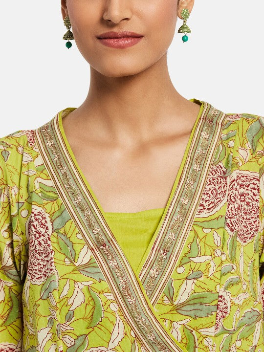 Product Details: Colour: Green Floral printed V-neck Three-quarter, flared sleeves Anarkali shape with angrakha style Ankle length with flared hem Machine weave regular cotton Material & Care: Cotton Hand wash