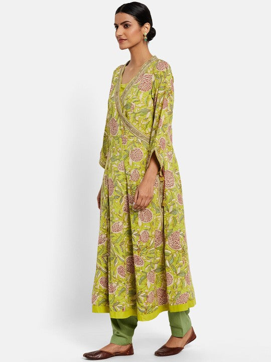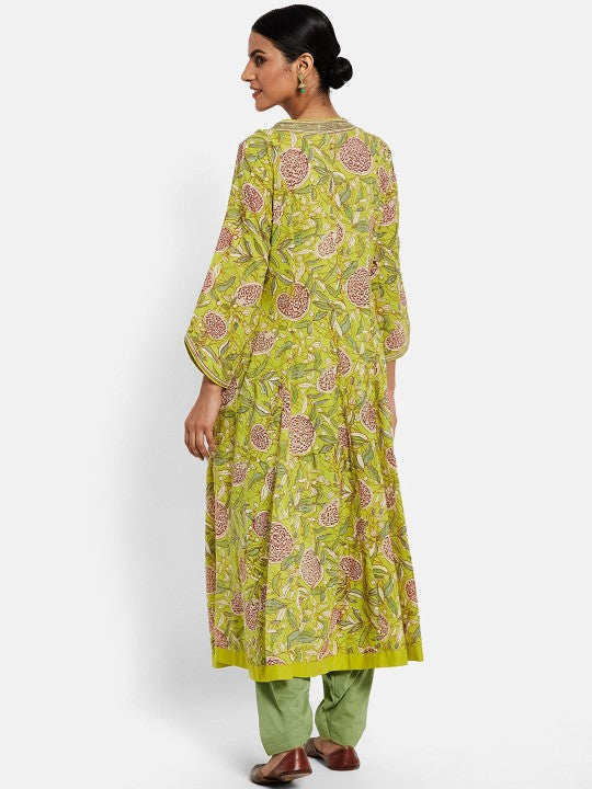 Fabindia Women Green Floral Printed Flared Sleeves Cotton Anarkali Kurta