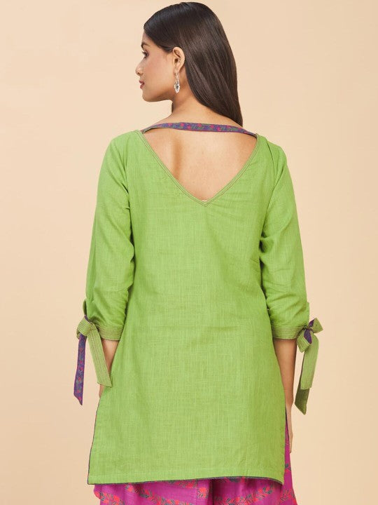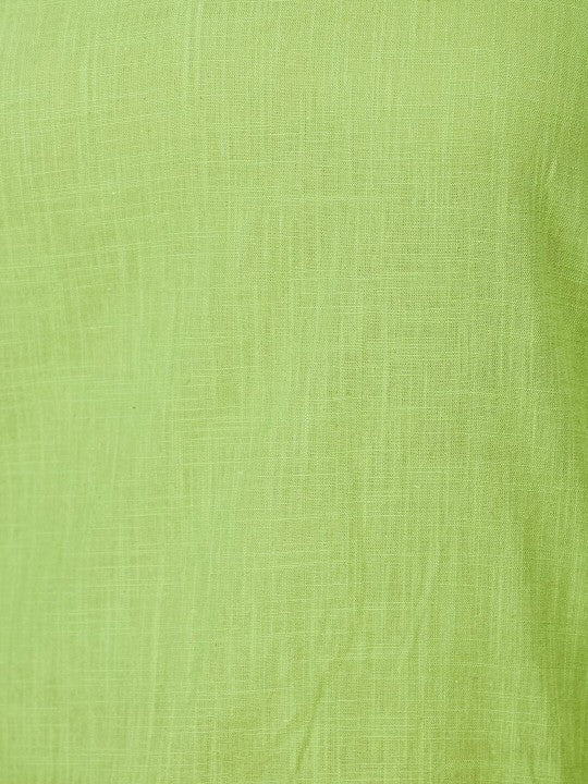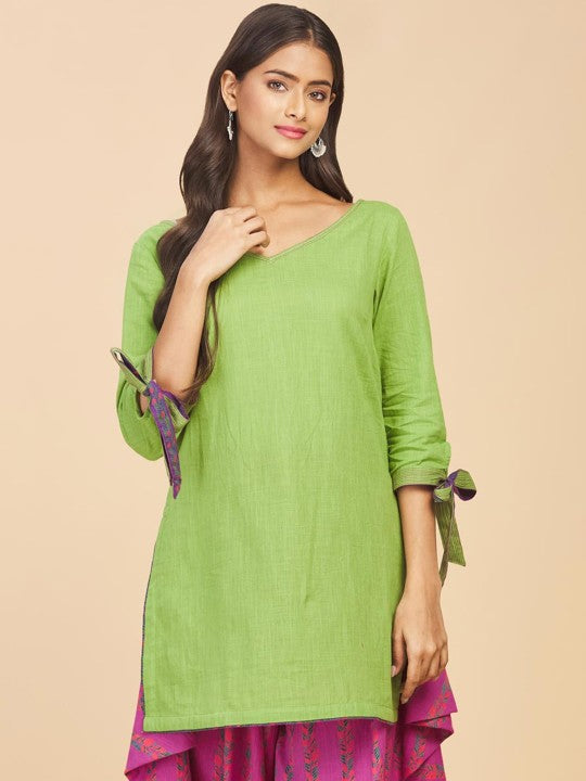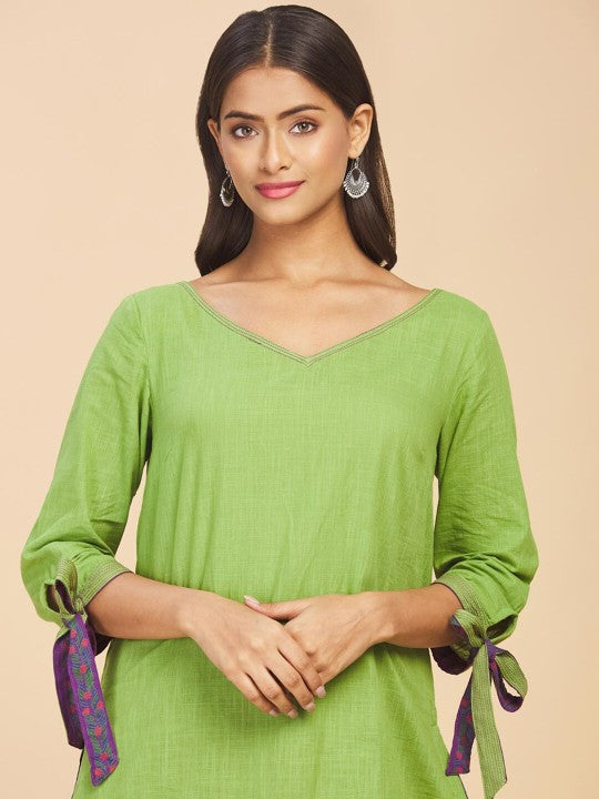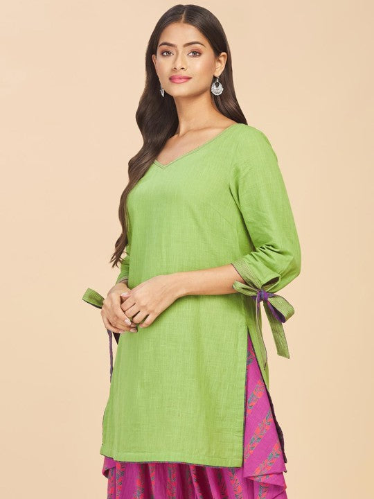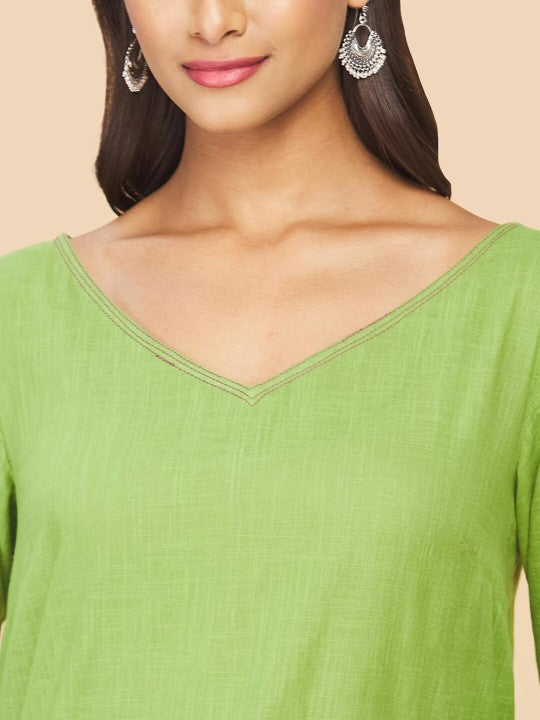 Product Details: Green straight kurti Solid V-neck, three-quarter, flared sleeves Knitted and woven regular pure cotton Material & Care: Cotton Hand Wash