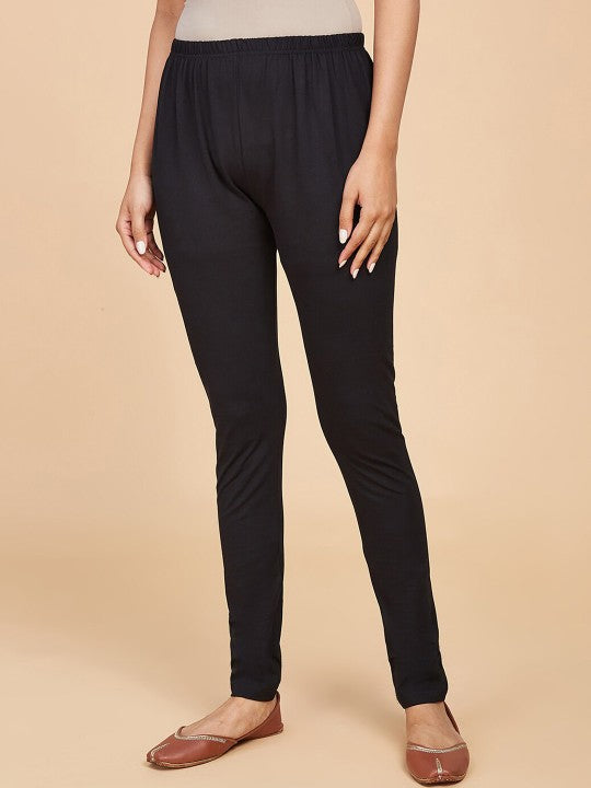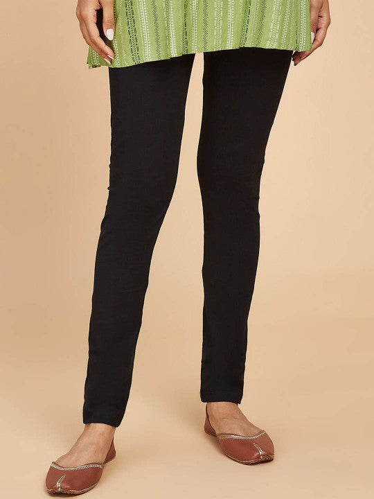 - Black solid churidar leggings with an elasticated waistband and slip-on closure