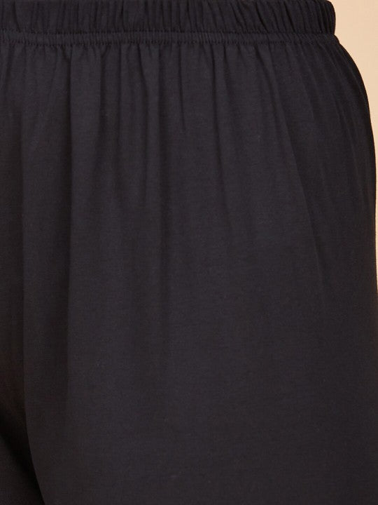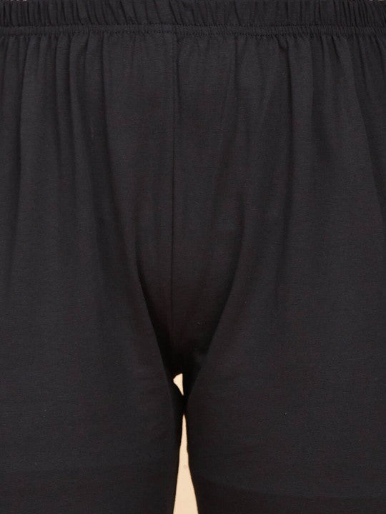 Product Details: Black solid churidar leggings with an elasticated waistband and slip-on closure Material & Care: Cotton Machine Wash