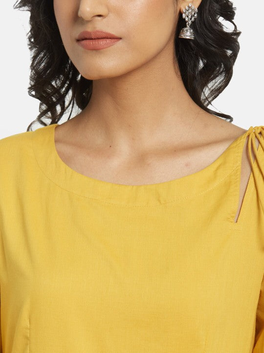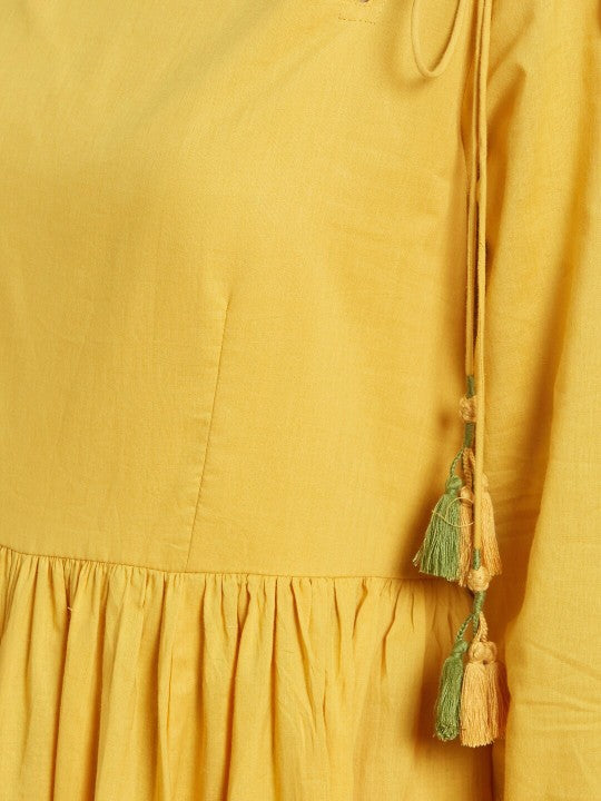 Product Details: Colour: Mustard Yellow Solid Round neck Long, puff sleeves Anarkali shape with regular style Tie up detail Ankle length with flared hem Knitted and woven regular cotton Material &...