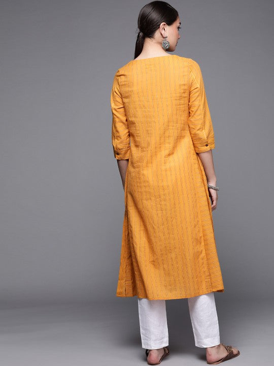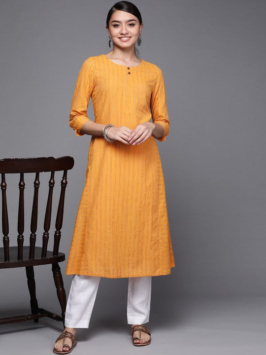 Product Details: Colour: Mustard Yellow Striped Round neck Three-quarter, regular sleeves A-line shape with regular style Thread work detail Calf length with flared hem Machine weave regular cotton Material & Care:...