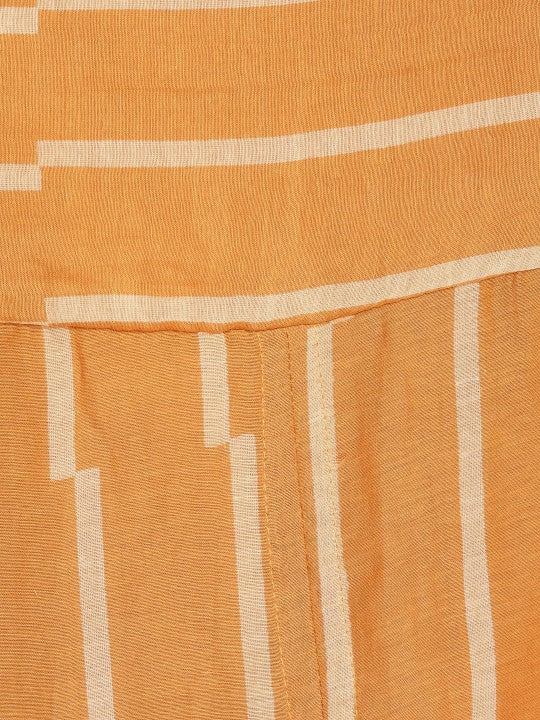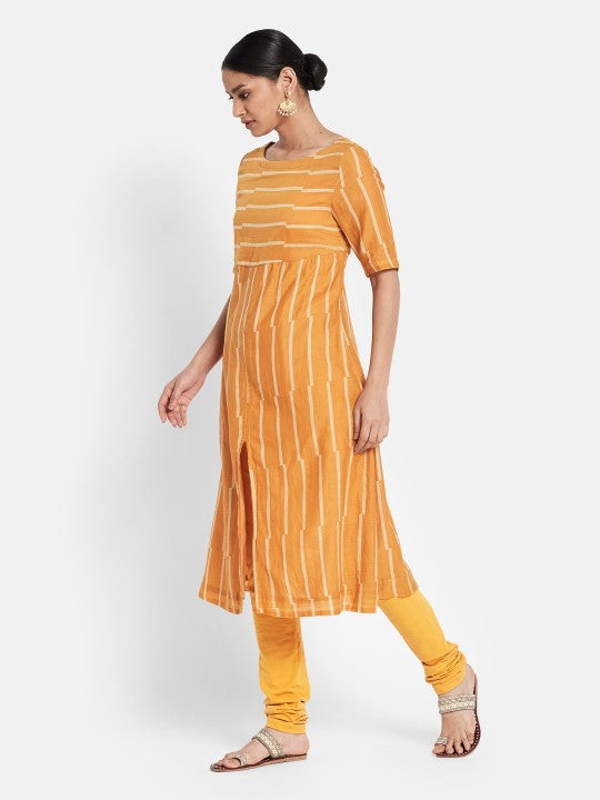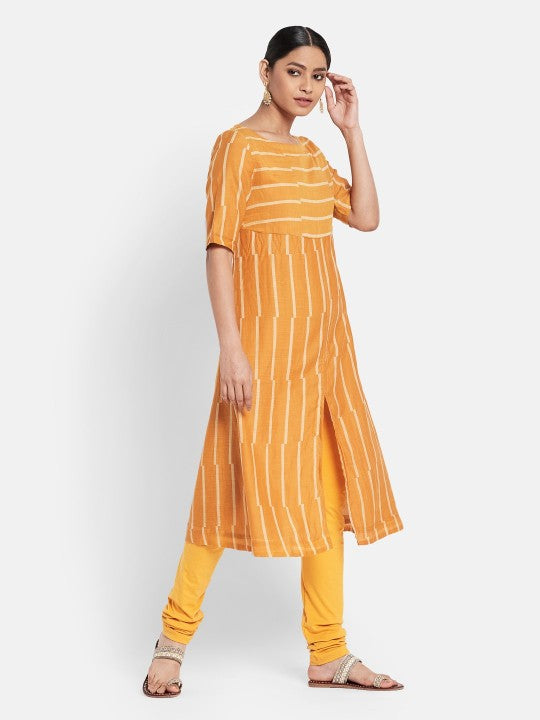 Product Details: Colour: Mustard Yellow Striped Boat neck Short, regular sleeves A-line shape with regular style Calf length with straight hem Machine weave regular cotton silk Material & Care: 75% Cotton...