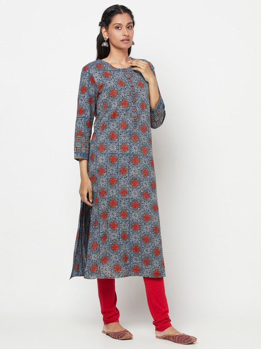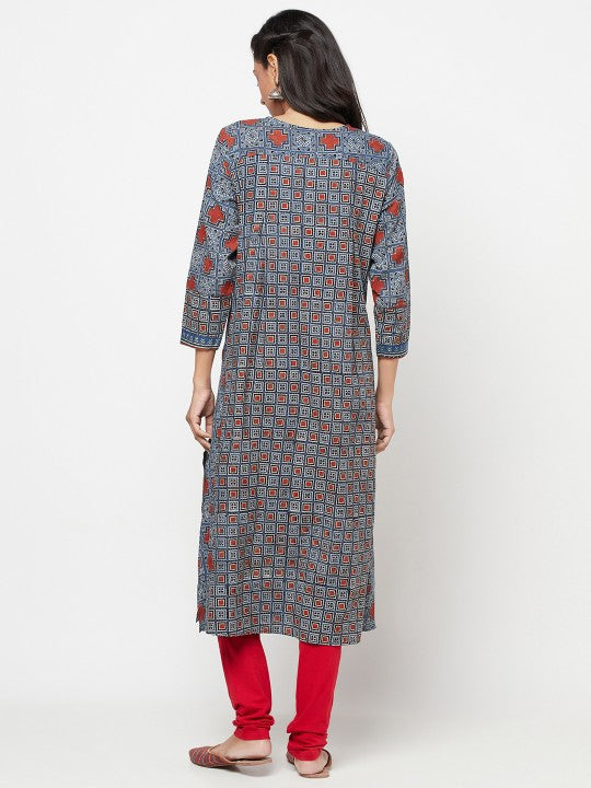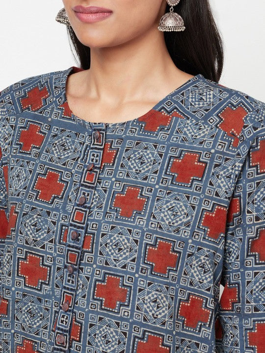 Fabindia Women Navy Blue & Maroon Pure Cotton Ajrakh Print Kurta