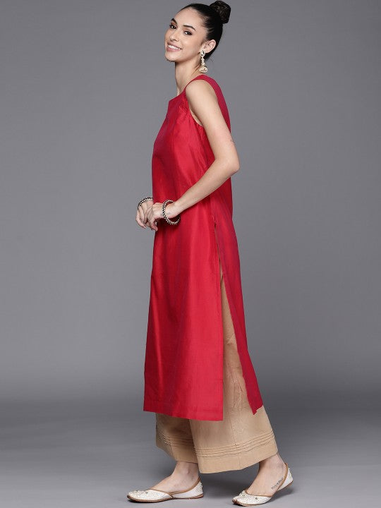 Product Details: Colour: Pink and Orange Striped Round neck Three-quarter, regular sleeves A-line shape with layered style Calf length with flared hem Machine weave regular cotton silk Material & Care: Cotton...