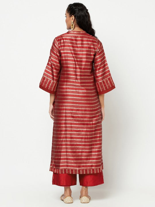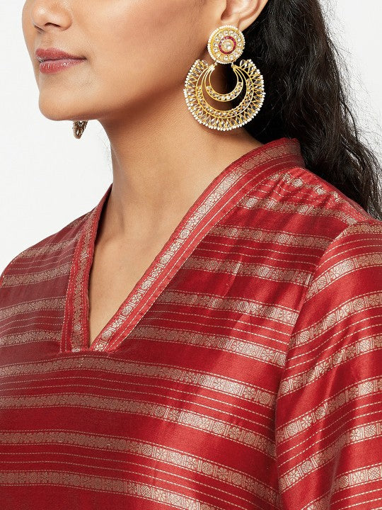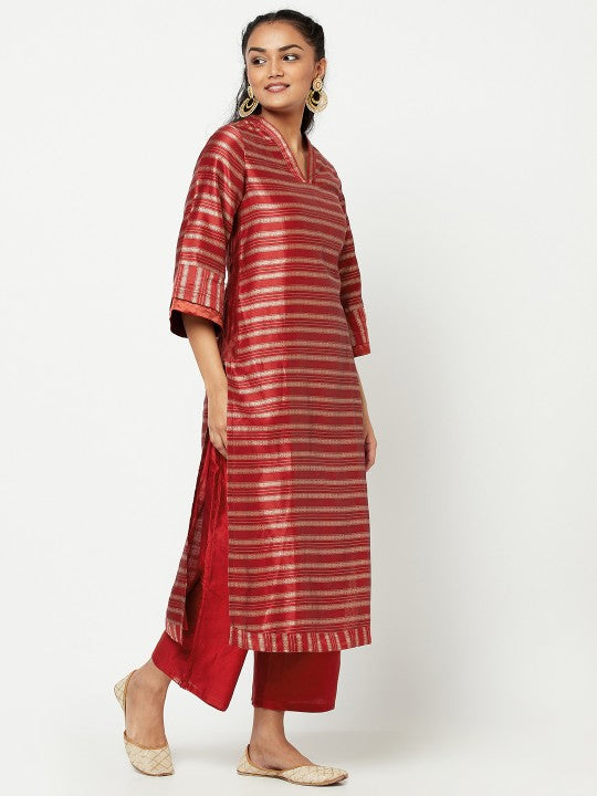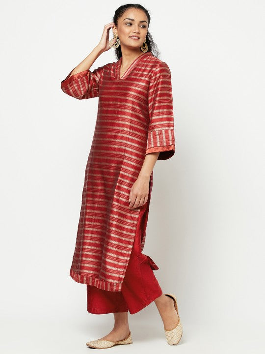 Fabindia Women Red & Silver Striped V-Neck Kurta