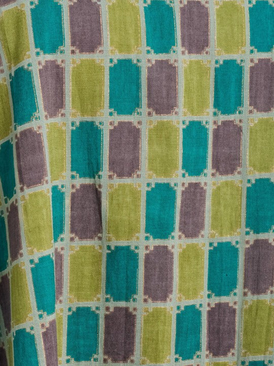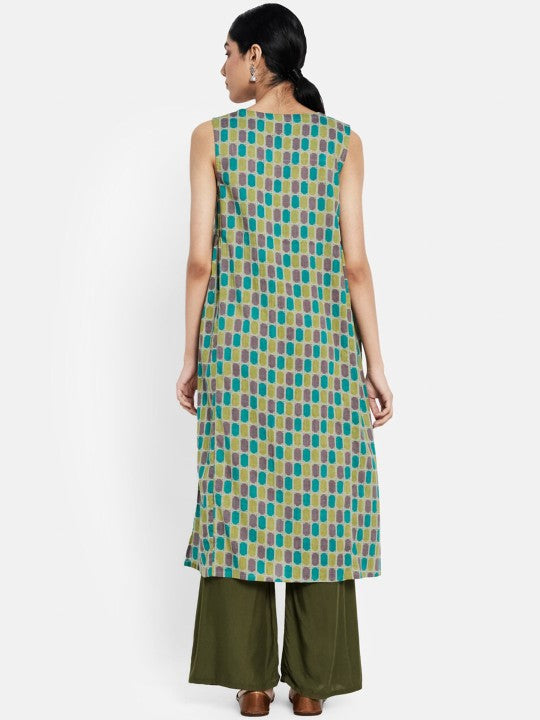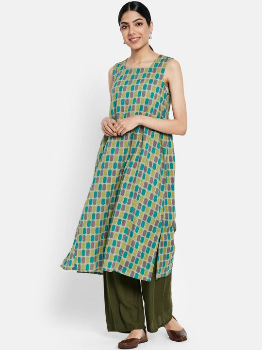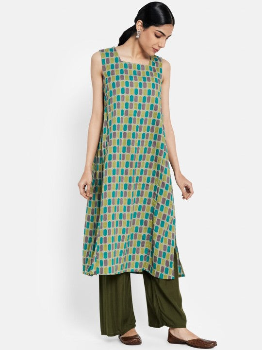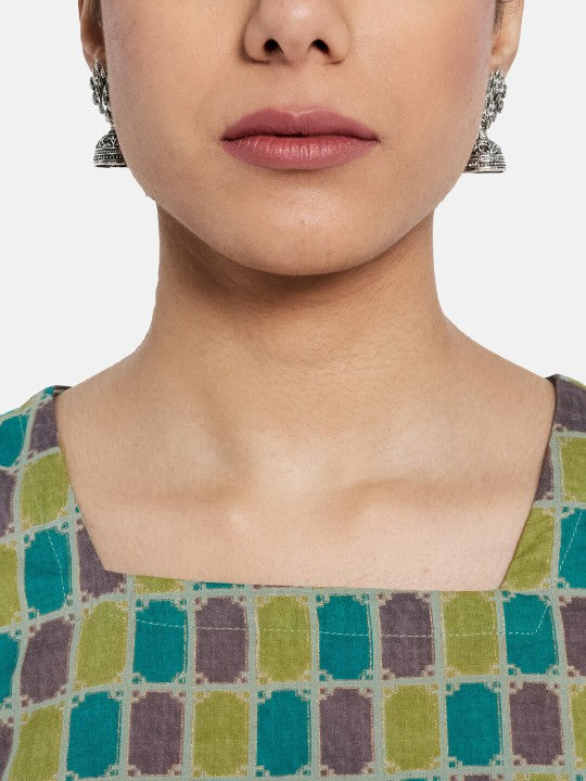 Fabindia Women Teal Blue & Purple Geometric Printed Cotton Kurta