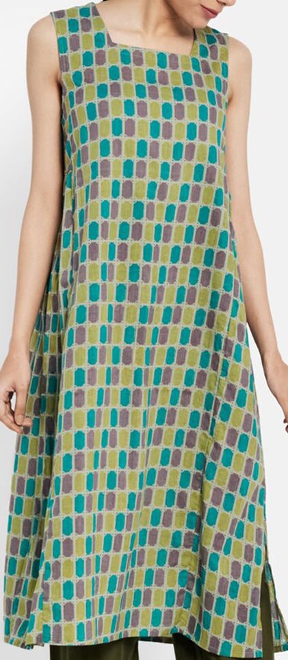 Product Details: Colour: Teal blue and Purple Geometric printed Square neck Sleeveless, no sleeves A-line shape with regular style Calf length with flared hem Knitted and woven regular cotton Material...