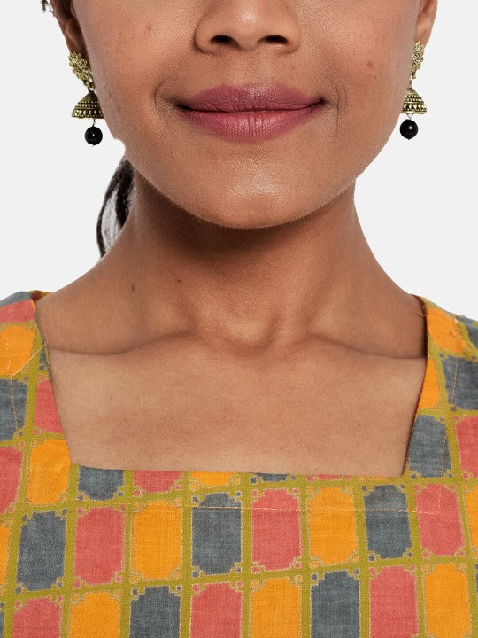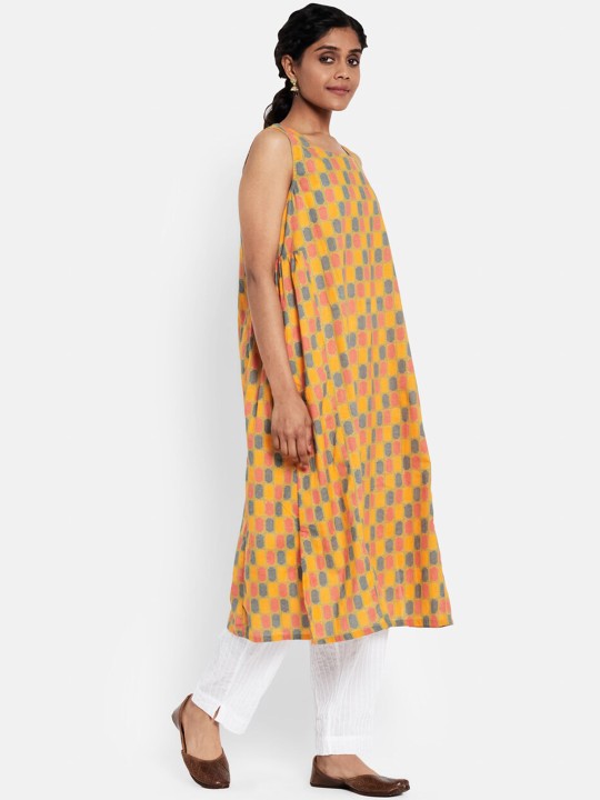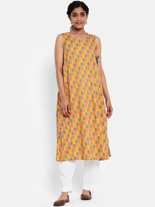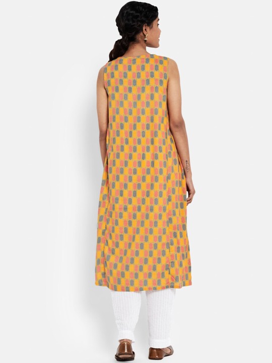 Fabindia Women Yellow & Blue Geometric Printed Cotton Kurta