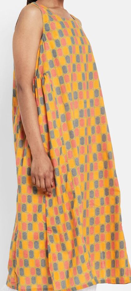 Product Details: Colour: yellow and blue Geometric printed Square neck Sleeveless, no sleeves A-line shape with regular style Calf length with flared hem Knitted and woven regular cotton Material & Care:...
