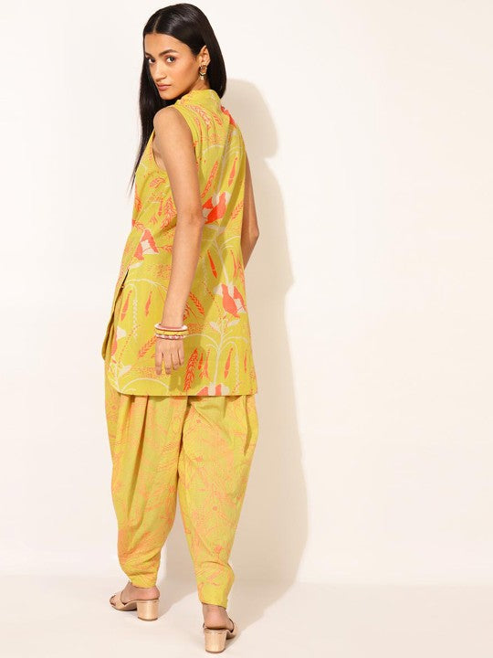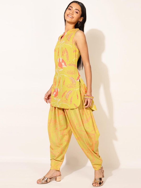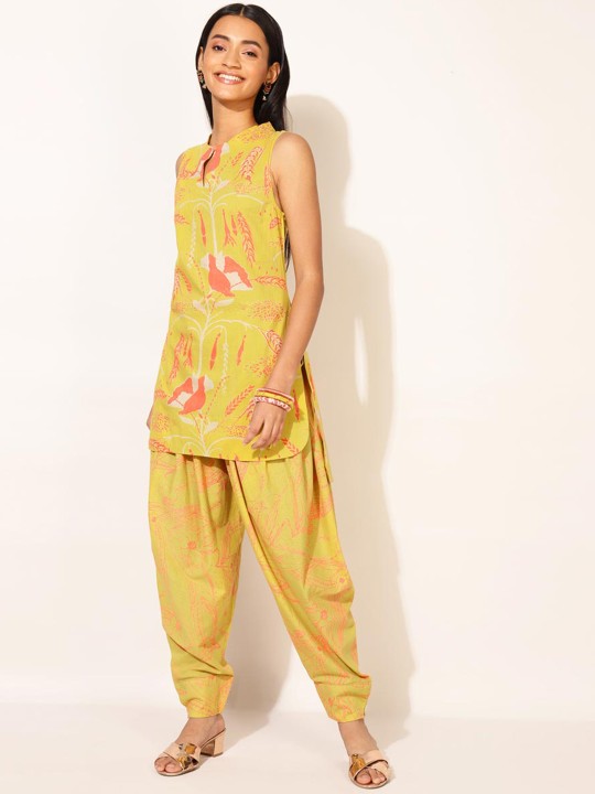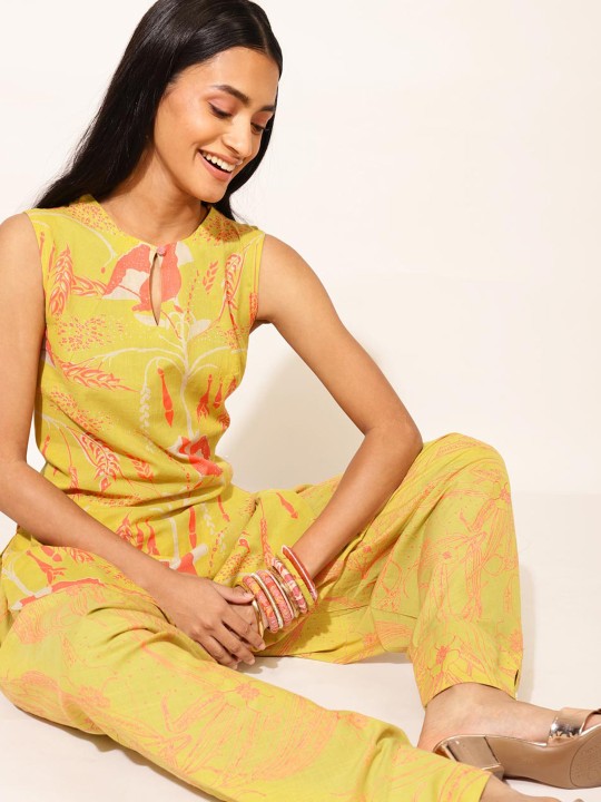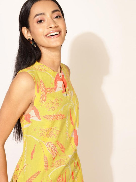 Product Details: Yellow and red straight kurti Floral printed Keyhole neck, sleeveless, no sleeves Machine weave regular pure cotton Material & Care: Pure Cotton Hand Wash