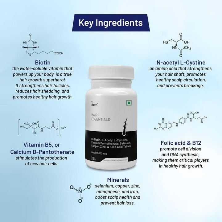 - Healthy Hair & Growth: Formen Biotin tablets help strengthen hair, reduce hair fall & enhance hair texture and volume, ultimately fostering robust hair growth and diminishing vulnerability to breakage, shedding & damage.