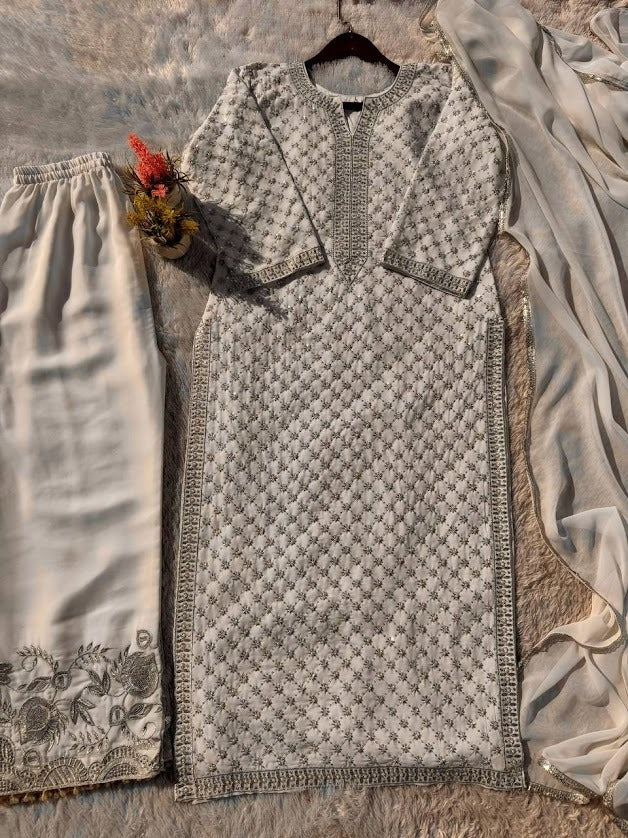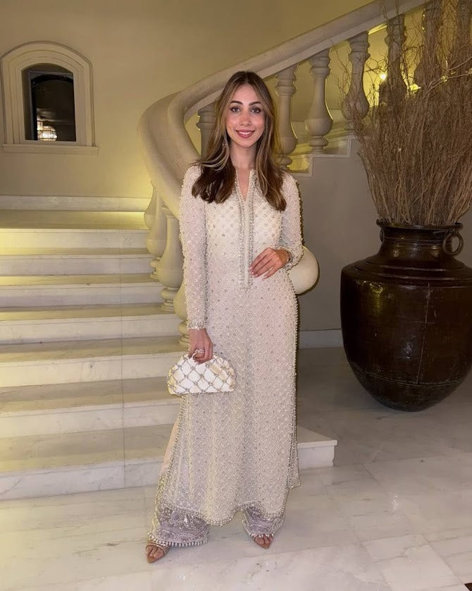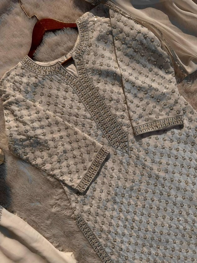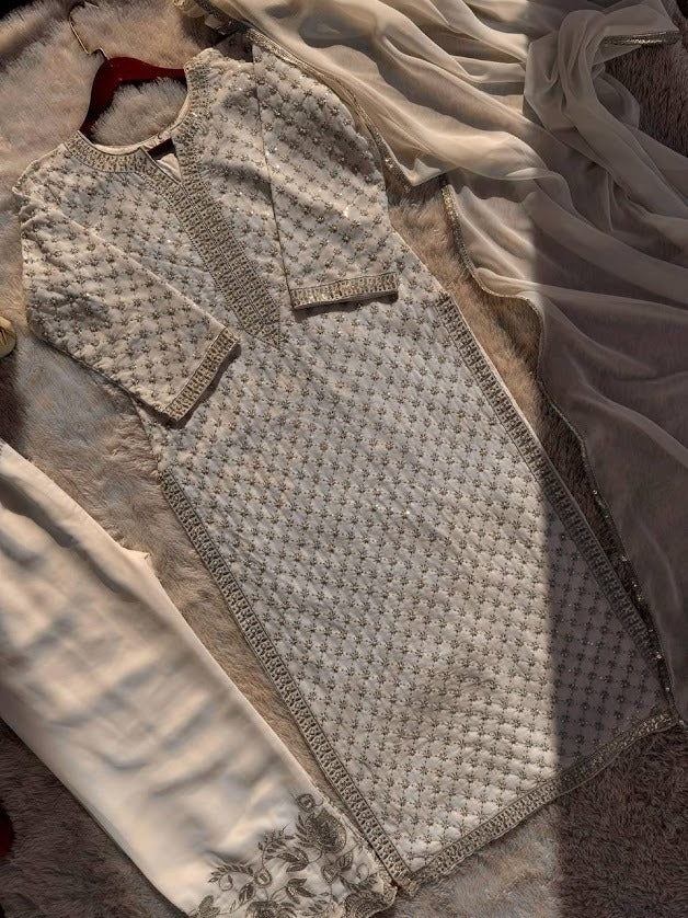 Ivory Hand Embroidered Kurti Pant Set with Sheer Dupatta Elegant Wedding Wear