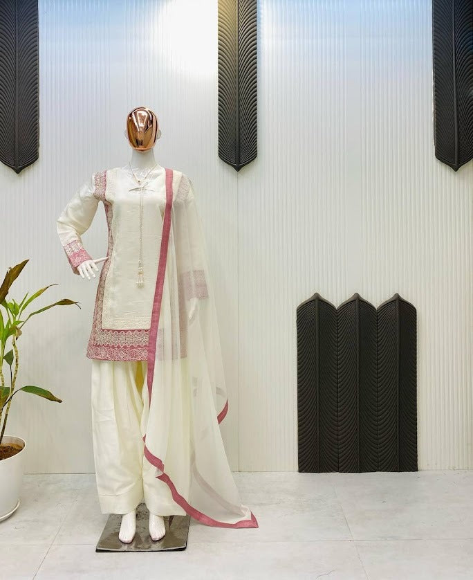 Ivory White Cotton Suit with Pink Embroidered Borders and Dupatta Classic Ethnic Wear for Festive Occasions