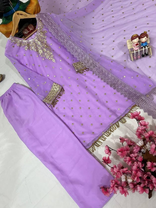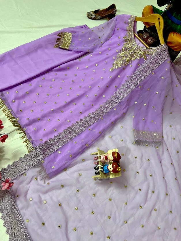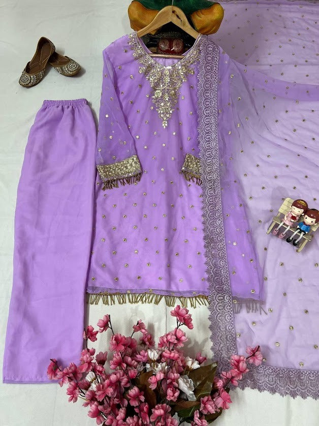 Lavender Georgette Embroidered Kurti Plazzo Set with Lace Dupatta
