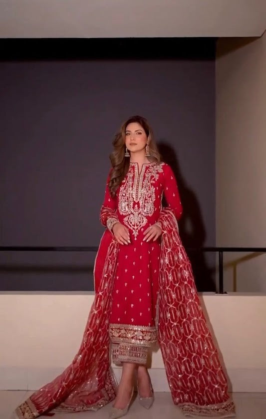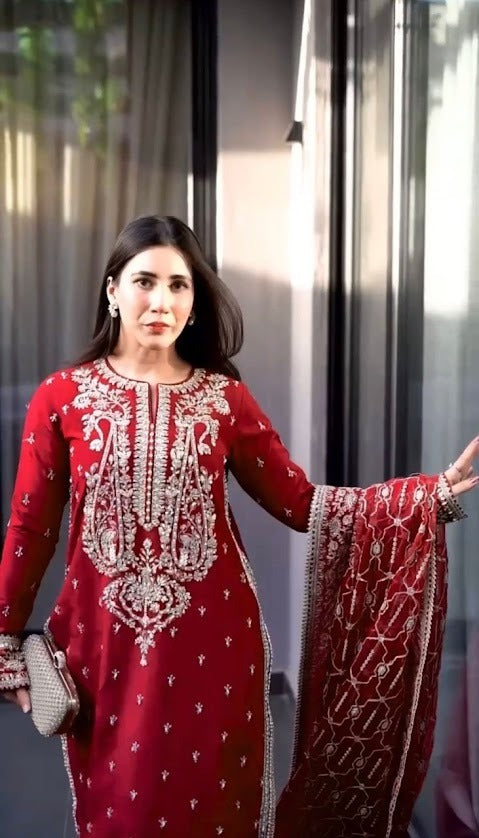 Luxurious Maroon Red Embroidered Pakistani Suit with Dupatta Wedding Wear