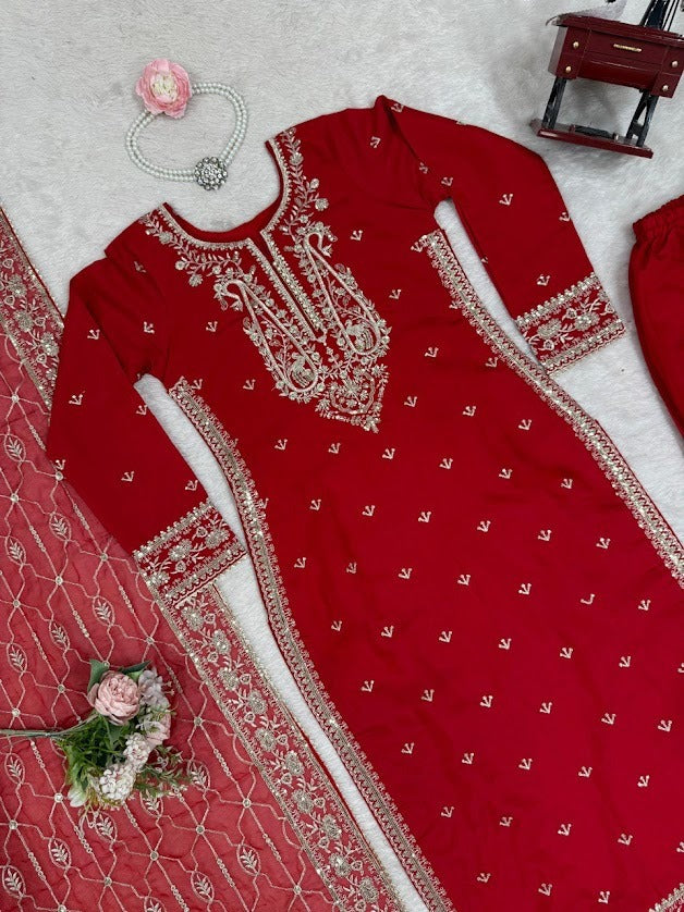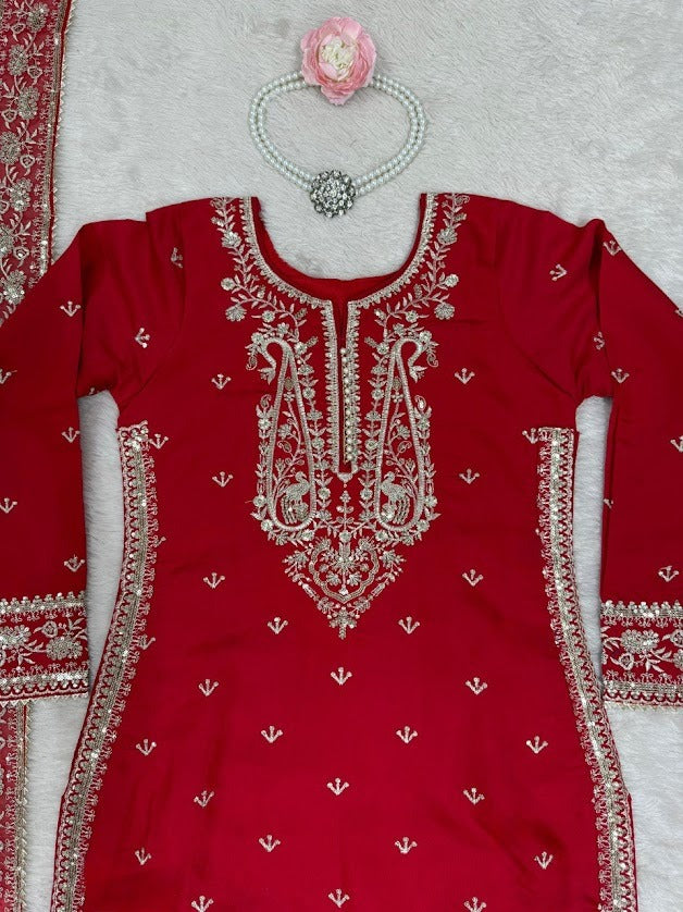 Description: Looking for this same colour beautiful Designer Suit on Roman Silk febric With Thred & Sequnce work and Palzoo on also Roman Silk febric With Thred & Sequnce work and...