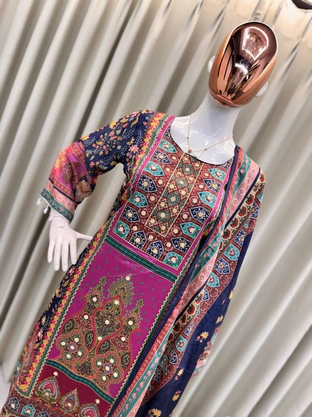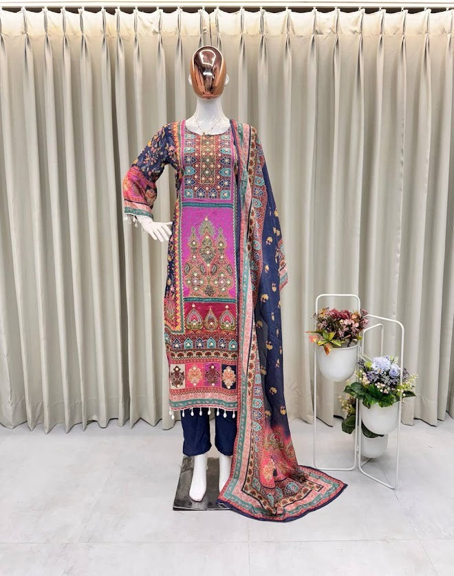 Multicolor Printed Pakistani Style Suit Set Blue Lawn Cotton Kurta with Dupatta & Pant
