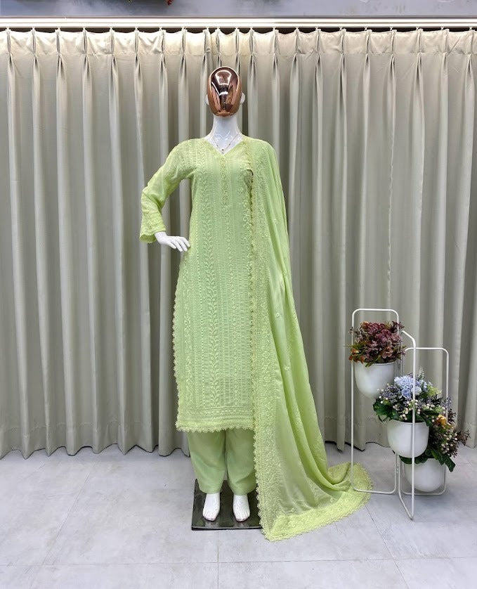 Pistachio Green Embroidered Cotton Suit Set Elegant Straight Kurta with Pants & Dupatta