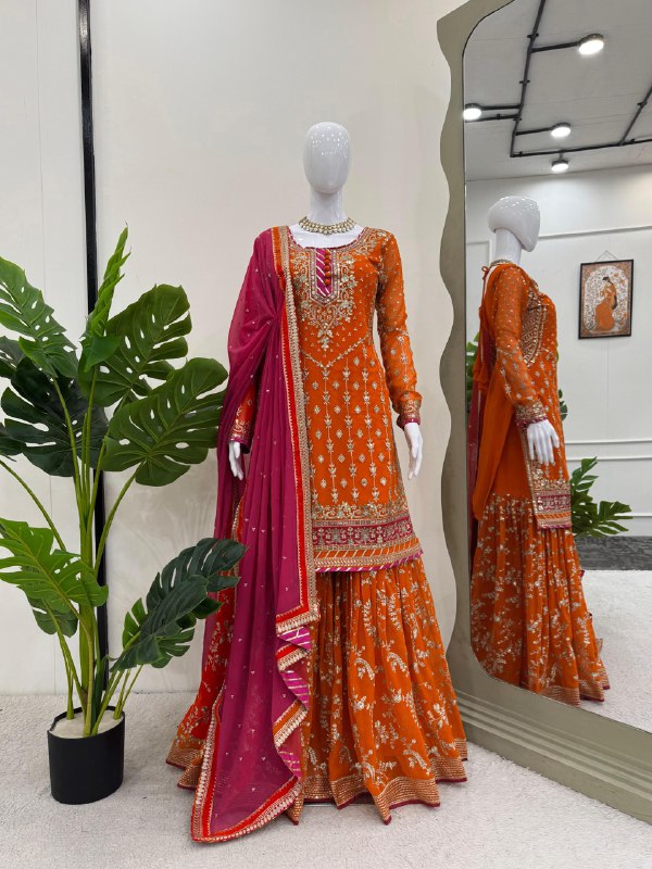 Specification: Fabric : Foux Gorgette Inner : Micro Work : thread with sequence Stich : *M(38),XL(42),XXL(44) with 3xl margin Sharara: Fabric :- Foux Gorgette Inner :- micro cotton Work :- thread...