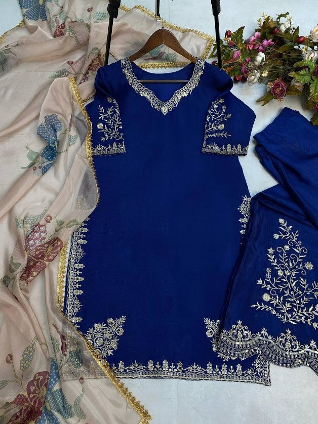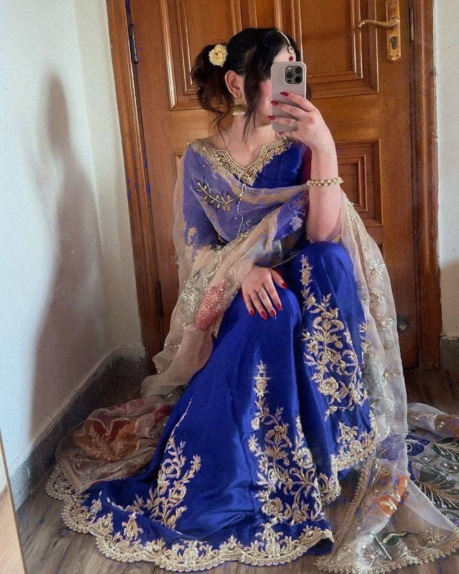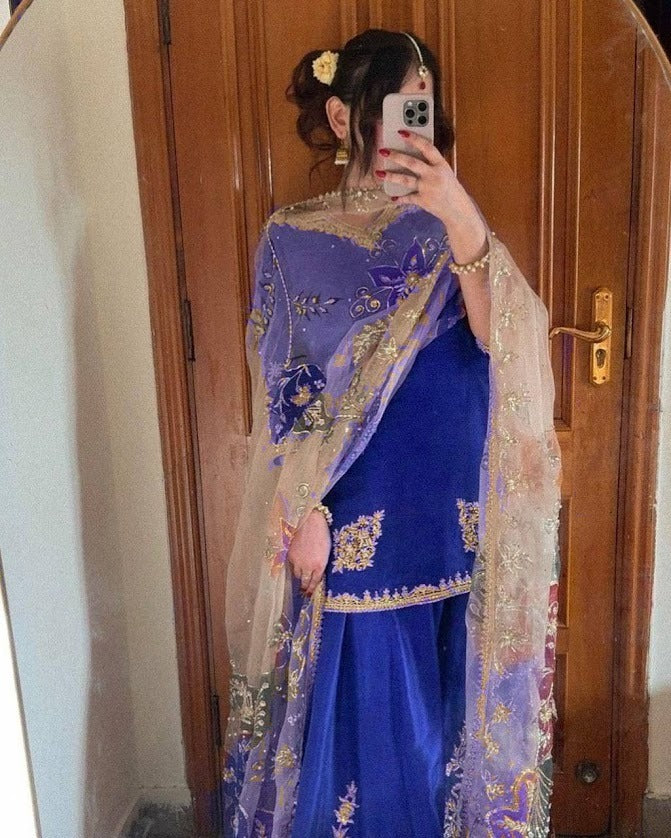 Royal Blue Embroidered Sharara Suit Set with Floral Printed Dupatta Festive Wear