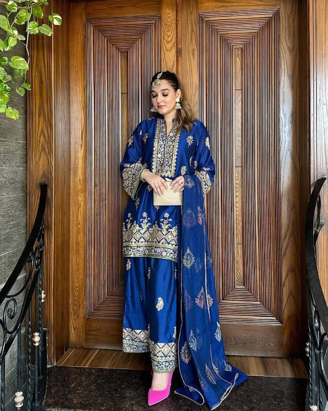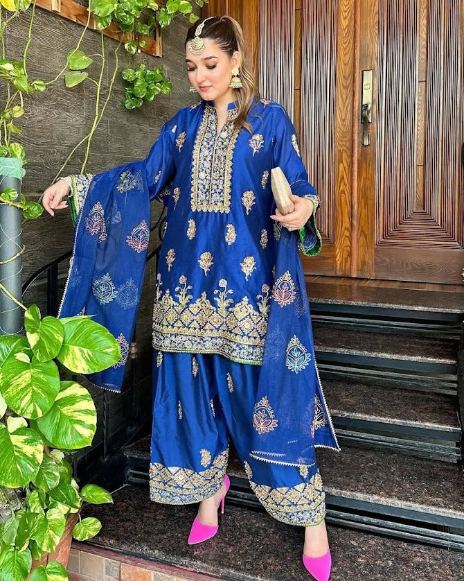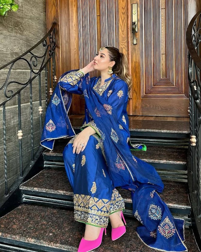 Royal Blue Embroidered Silk Pakistani Suit with Golden Zari Work Wedding Wear