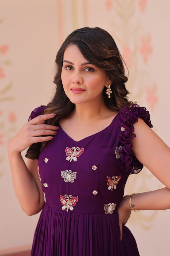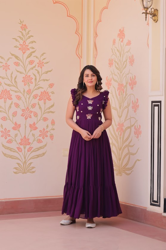 Royal Purple Butterfly Embroidered Gown with Ruffle Sleeves Elegant Partywear