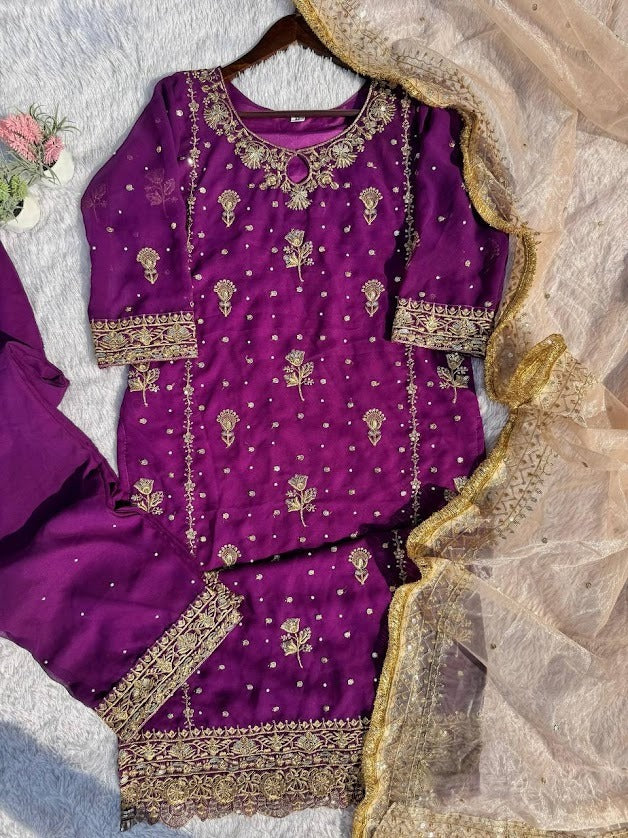 Royal Purple Embroidered Suit Set with Golden Lace Dupatta Graceful Traditional Attire