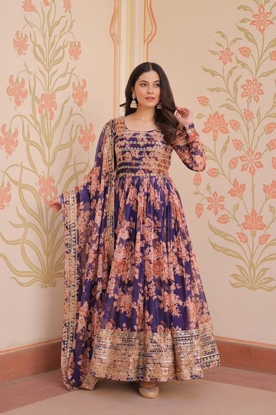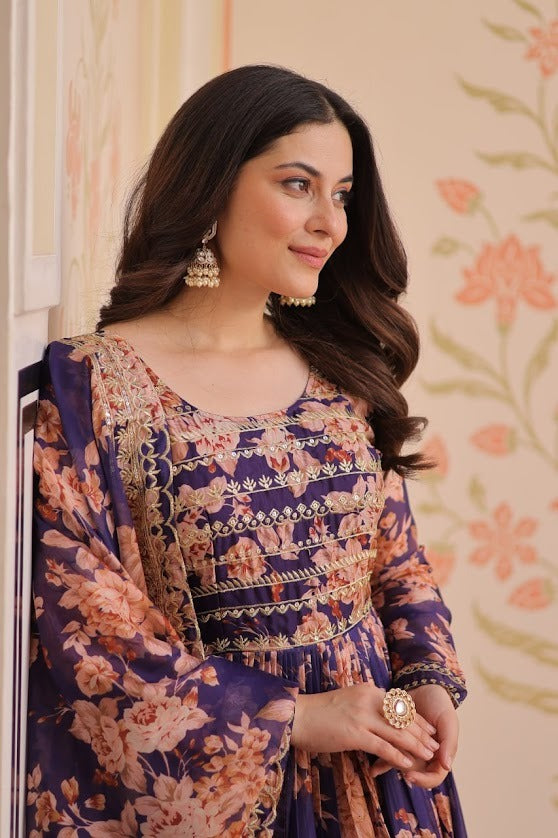 Royal Purple Floral Anarkali Set with Embroidered Sequin Border Elegant Festive Wear for Weddings