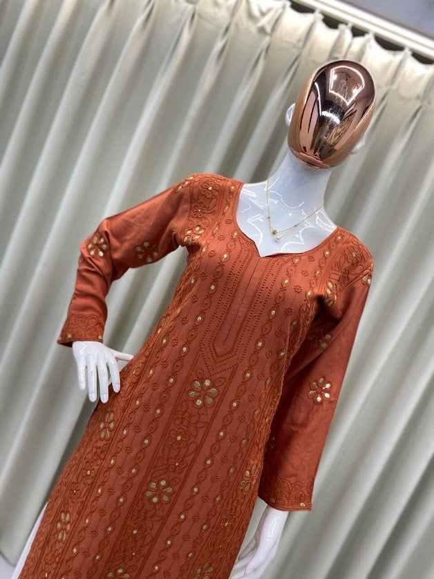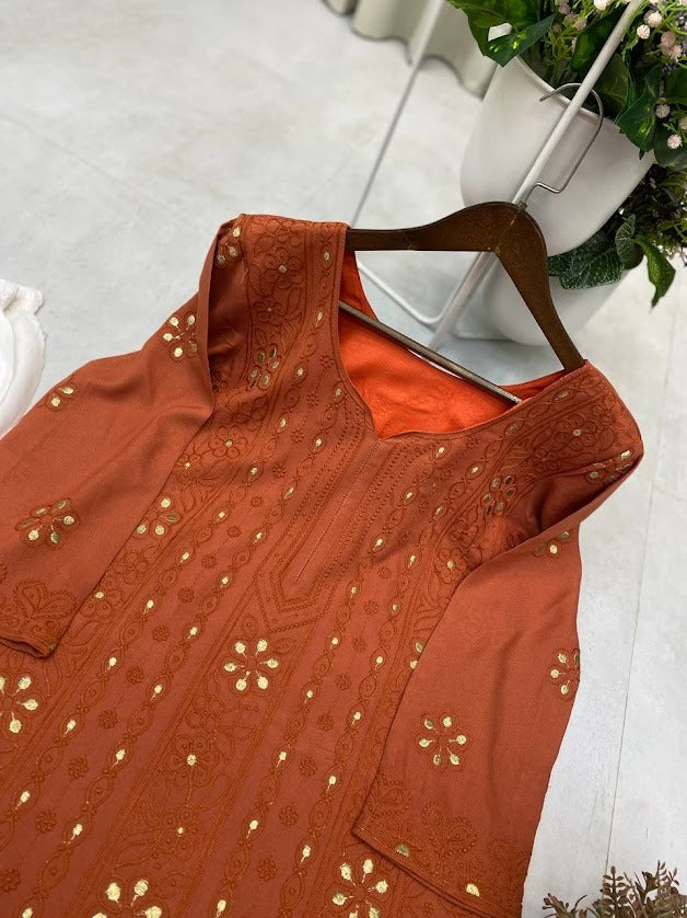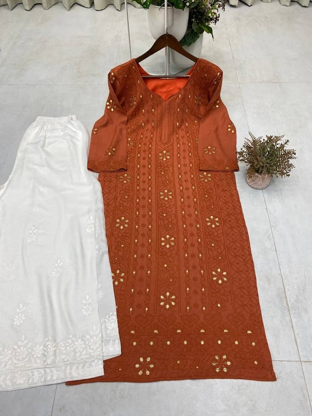 Rust Orange Mirror Work Kurta Set Elegant Straight Fit Kurti with White Embroidered Palazzo
