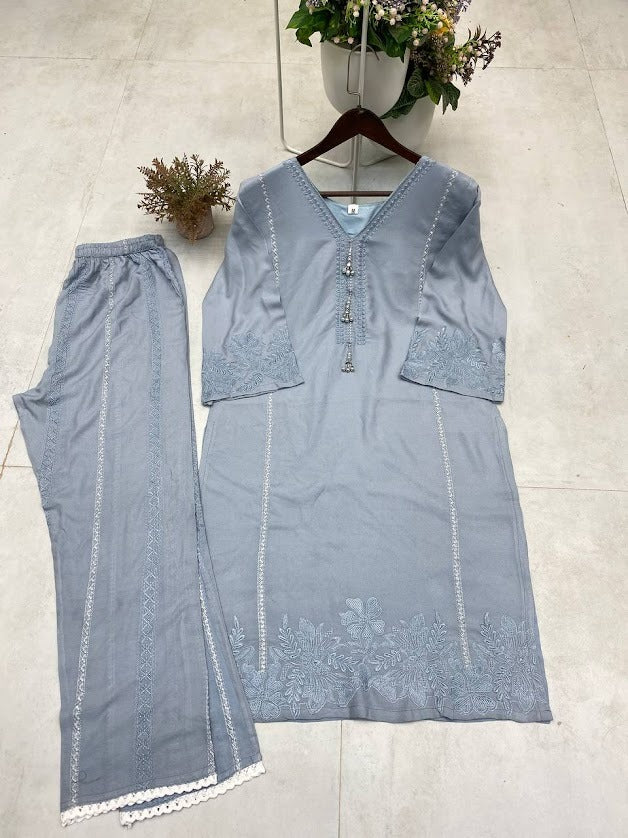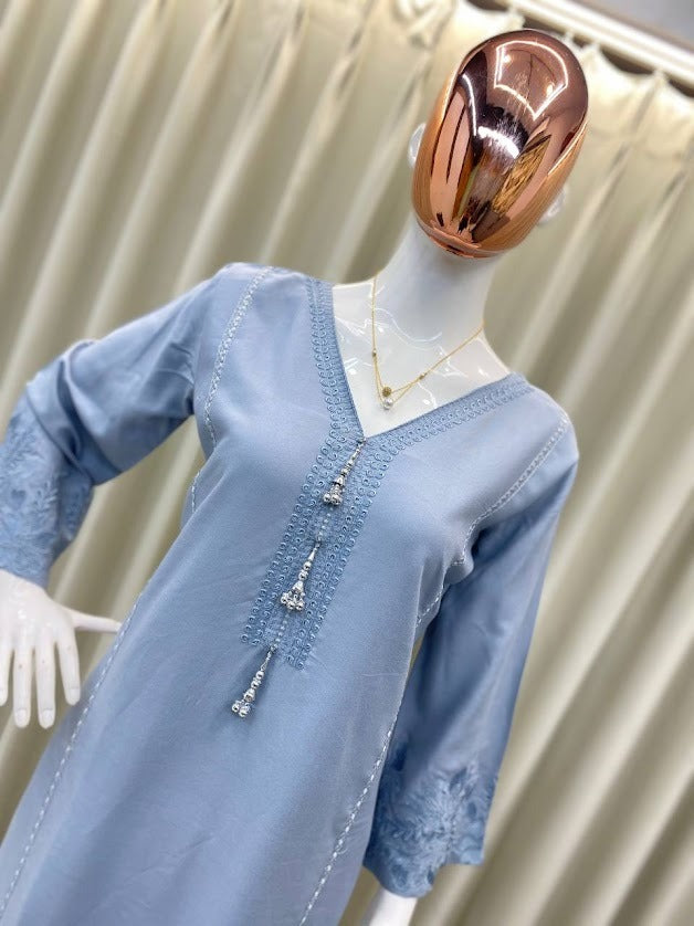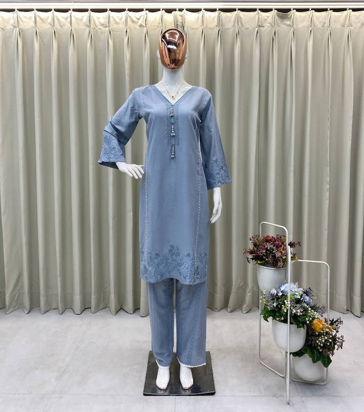 Sky Blue Cotton Kurta Set with Delicate Embroidery Graceful Daily Wear Ensemble
