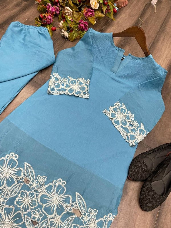 Sky Blue Floral Embroidered Co Ord Set Stylish Straight Kurta with Pant for Casual Wear