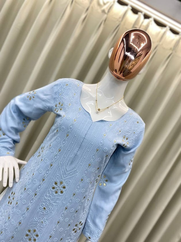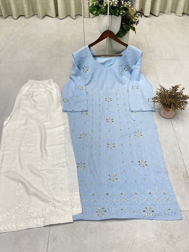 Sky Blue Mirror Work Kurta Set Elegant Straight Cotton Kurti with White Embroidered Palazzo