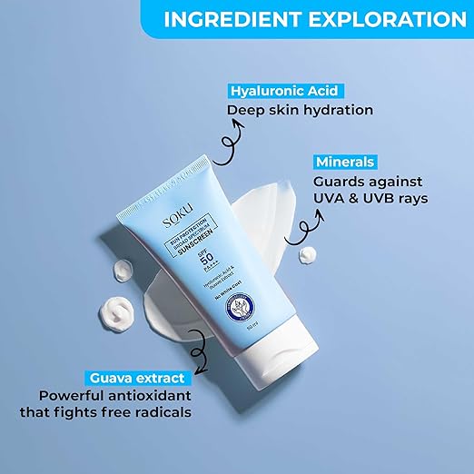 Description: PROTECTION WITH SPF 50 PA+++: SOKU Broad Spectrum Sunscreen provides powerful protection against harmful UVA, UVB, and blue light rays, preventing premature skin ageing and damage. This lightweight sunscreen spf50...