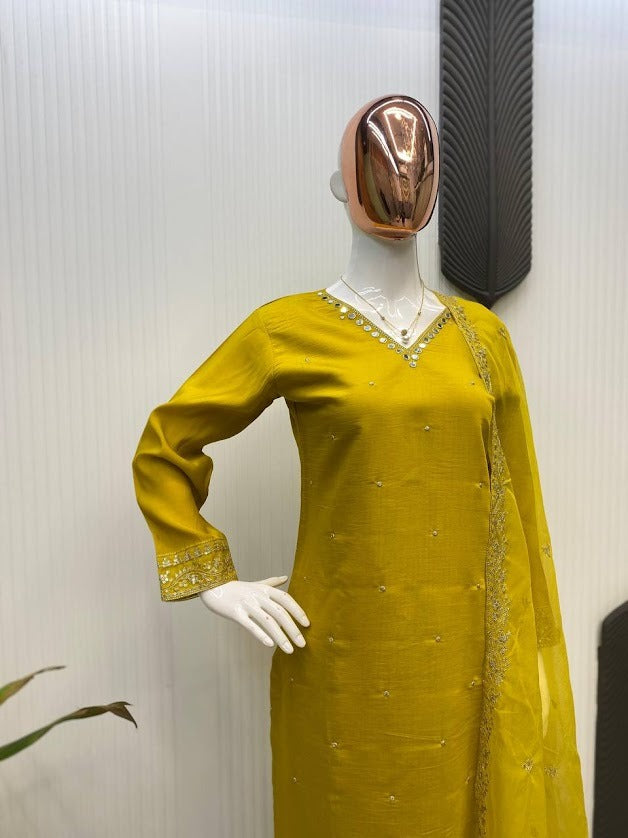 Sunshine Elegance Mustard Yellow Mirror Work Suit with Embroidered Dupatta
