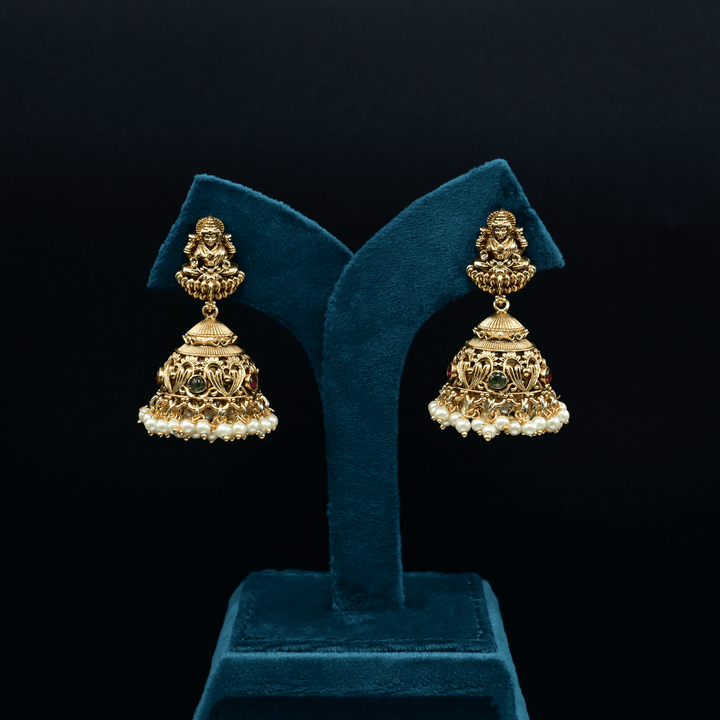 - Real Gold Look Handmade Exclusive Nakshi Work with Lakshmi Ji Temple Necklace Set With Semi Precious Ruby, Emerald Stones, Hanging Gold Beads, and Swarovski Pearls.