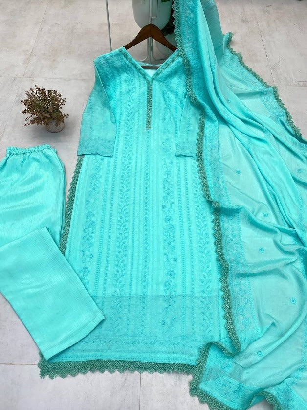 Turquoise Blue Embroidered Cotton Suit Set Straight Kurta with Pant & Net Dupatta