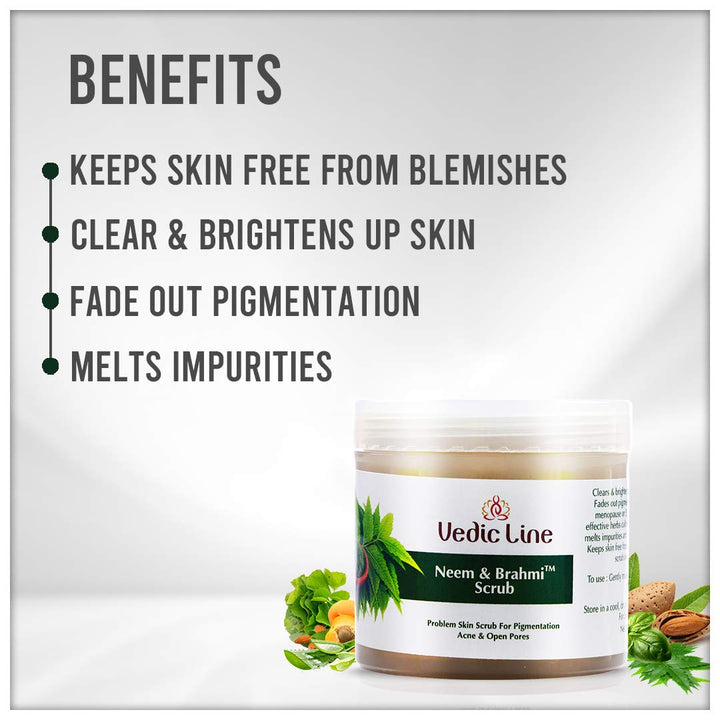 - Vedicline Neem & Brahmi Scrub is the answer to your need for complete skin care and bound to leave you with clean and smooth skin. Pollution and dust cause a variety of skin problems, including blackheads, whiteheads, zits and skin irritability.