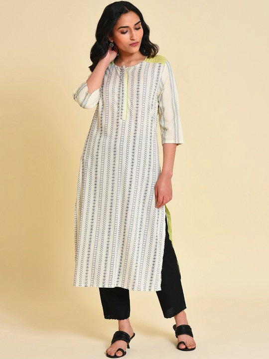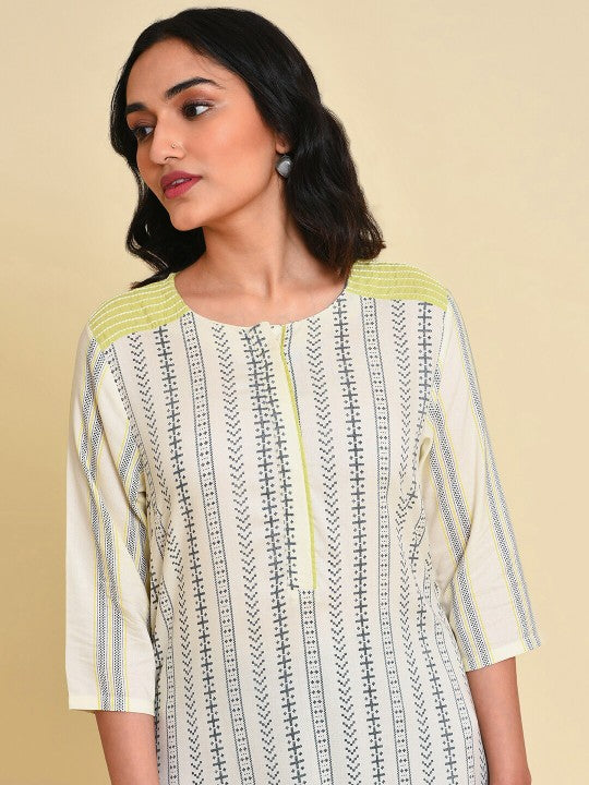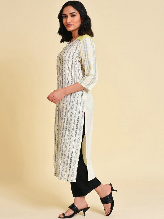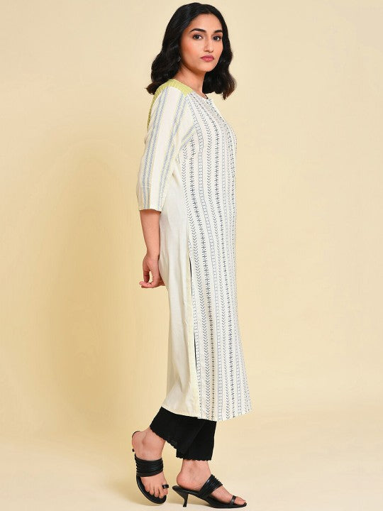 Product Details: Colour: White, Grey & Yellow Striped Round neck Three-quarter, regular sleeves Straight shape with regular style Thread work detail Ankle length with high-low hem Knitted and woven regular viscose...