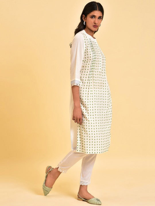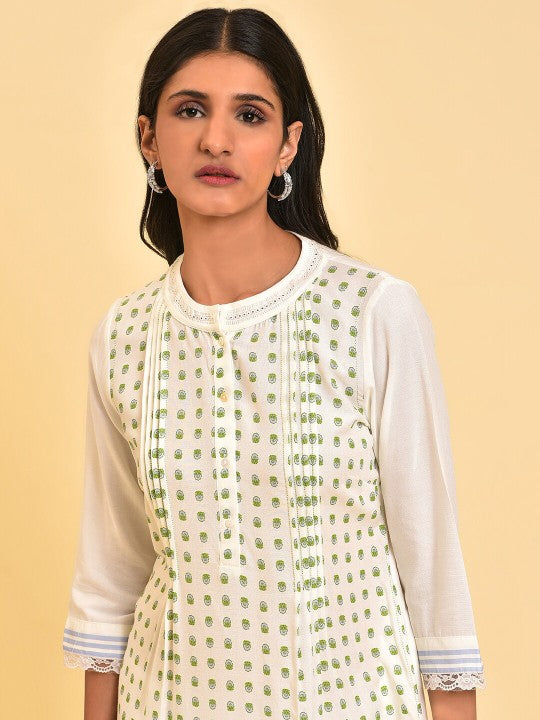 Product Details: Colour: White, Green and Blue Ethnic motifs printed Mandarin collar Three-quarter, regular sleeves Straight shape with regular style Knee length with straight hem Machine weave regular viscose rayon Material...