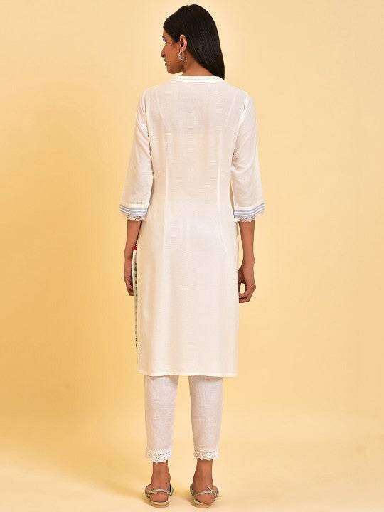 W White & Blue Ethnic Motifs Printed Mirror Work Mandarin Collar Kurta
