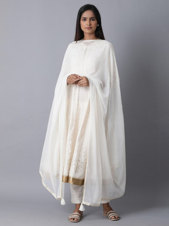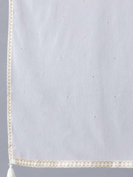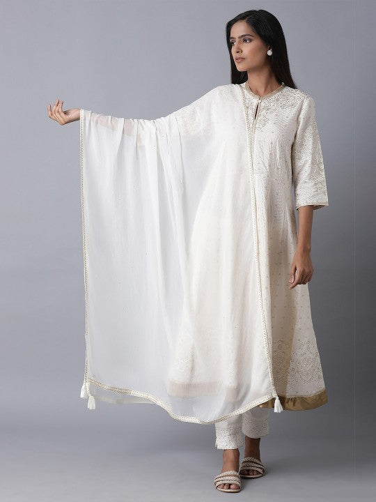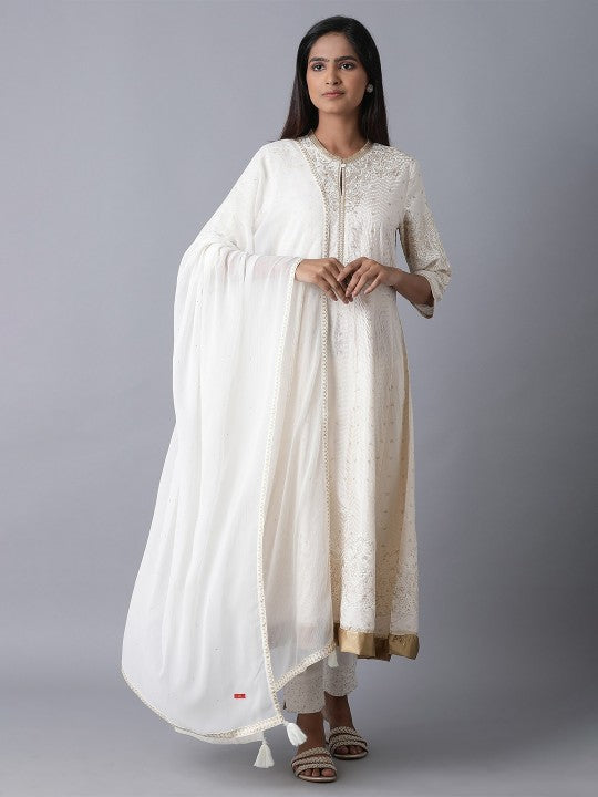 Product Details: White and gold-toned solid dupatta, solid border Size & Fit: Length: 2.22 m Width: 1.02 m Material & Care: Fabric Name : Chiffon Fabric Composition : 100% Manmade Fiber...