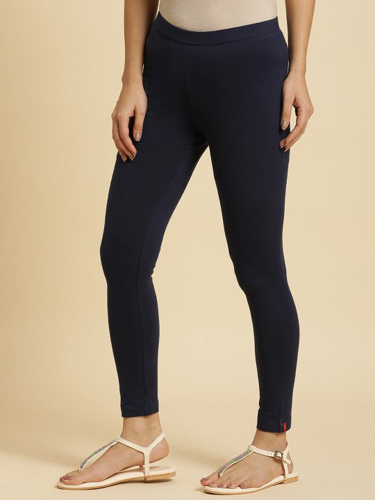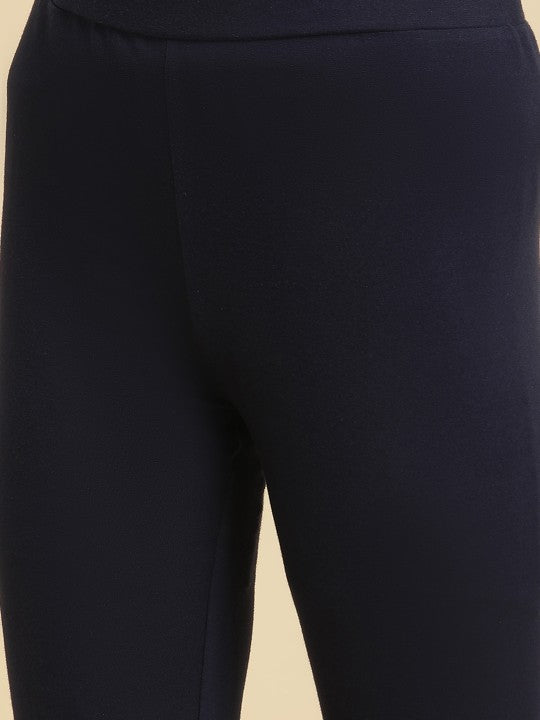 Product Details: Navy-blue solid ankle-length leggings, has an elasticated waistband with slip-on closure Material & Care: 95% Cotton & 5% Lycra Machine Wash