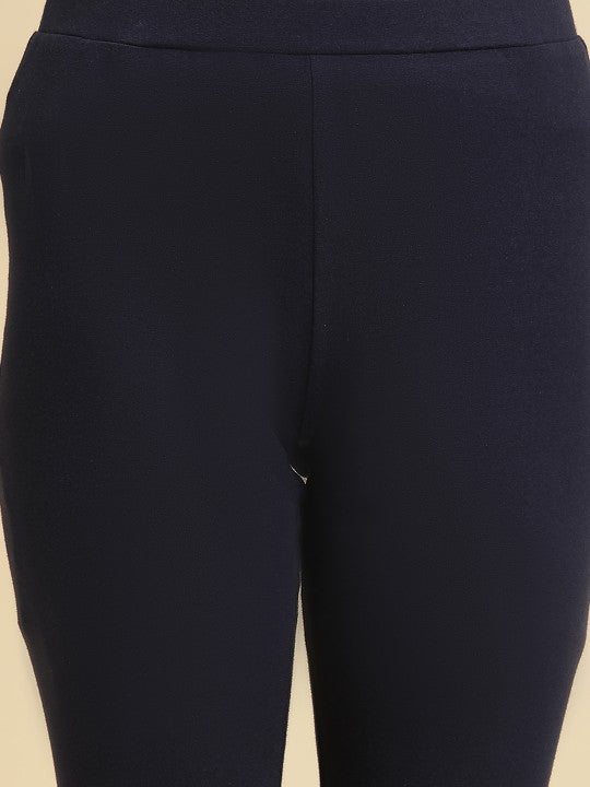 - Navy-blue solid ankle-length leggings, has an elasticated waistband with slip-on closure
