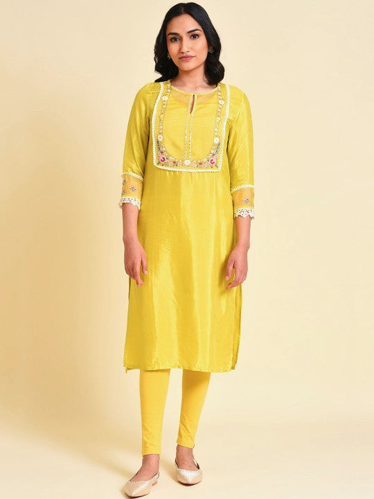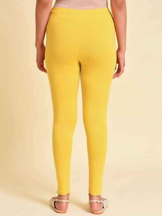 Product Details: Yellow solid ankle-length leggings, has an elasticated waistband and slip-on closure Material & Care: 95% Cotton 5% Lycra Machine Wash