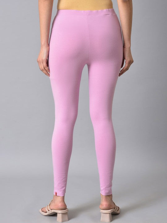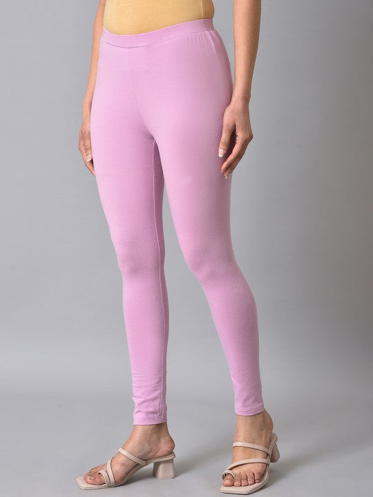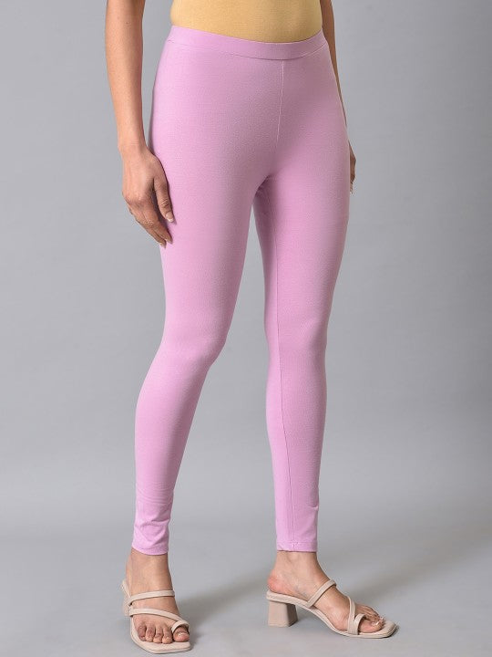 - Lavender-coloured solid ankle-length leggings, has an elasticated waistband and slip-on closure