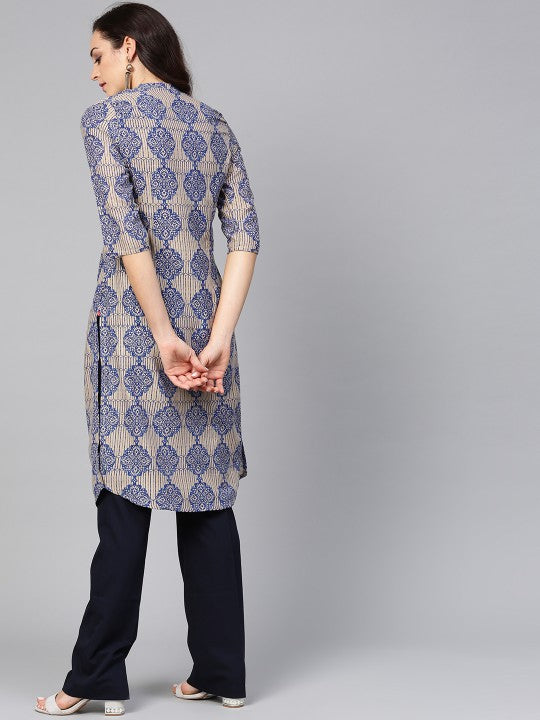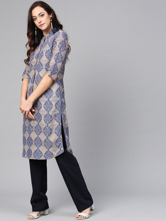 - Beige and blue printed straight kurta, has a mandarin collar with half button placket, three-quarter sleeves, curved hem, side slits