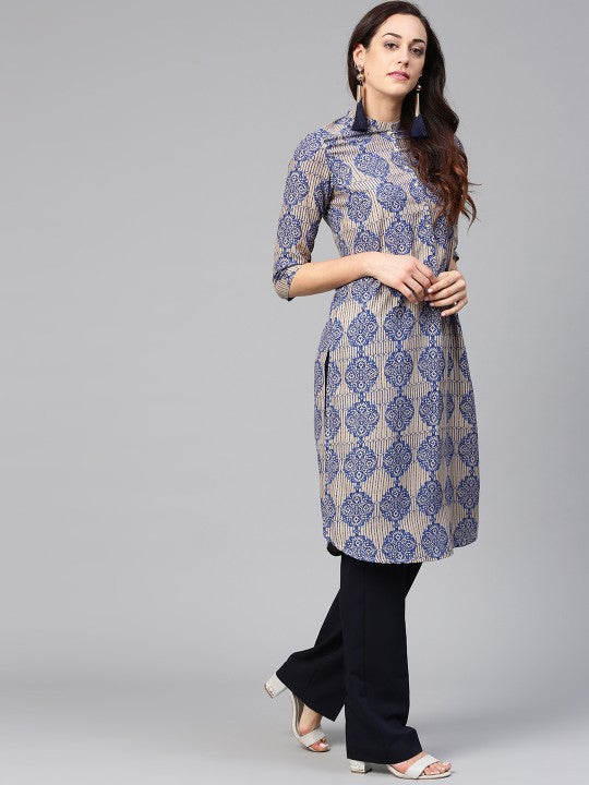 Product Details: Beige and blue printed straight kurta, has a mandarin collar with half button placket, three-quarter sleeves, curved hem, side slits Material & Care: Viscose Rayon Hand-wash