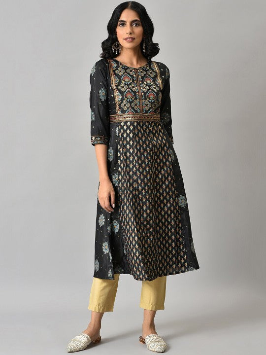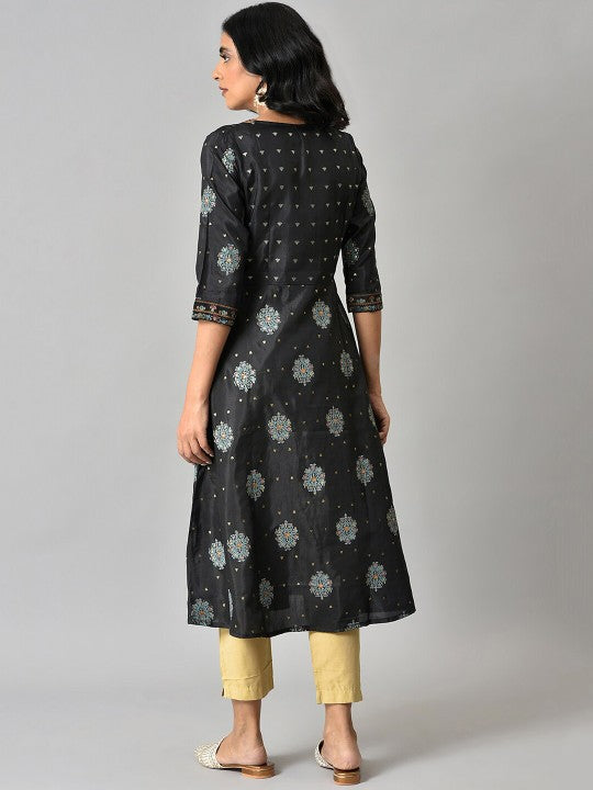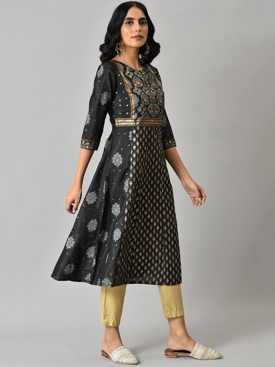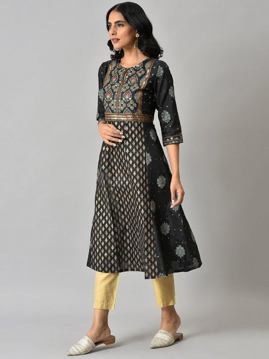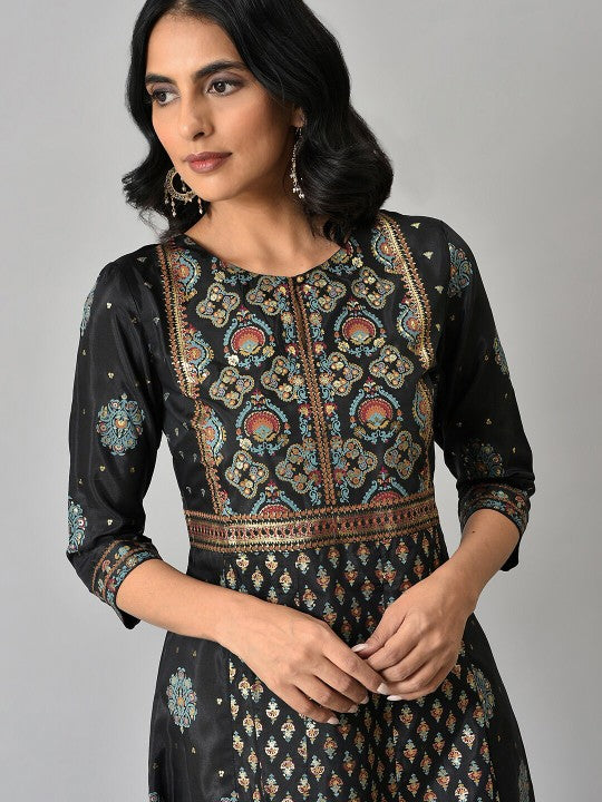 Product Details: Colour: Black Abstract printed Round neck Three-quarter, regular sleeves Staright shape with Regular style Calf length with flared hem Handloom regular polyester Material & Care: Polyster Machine Wash